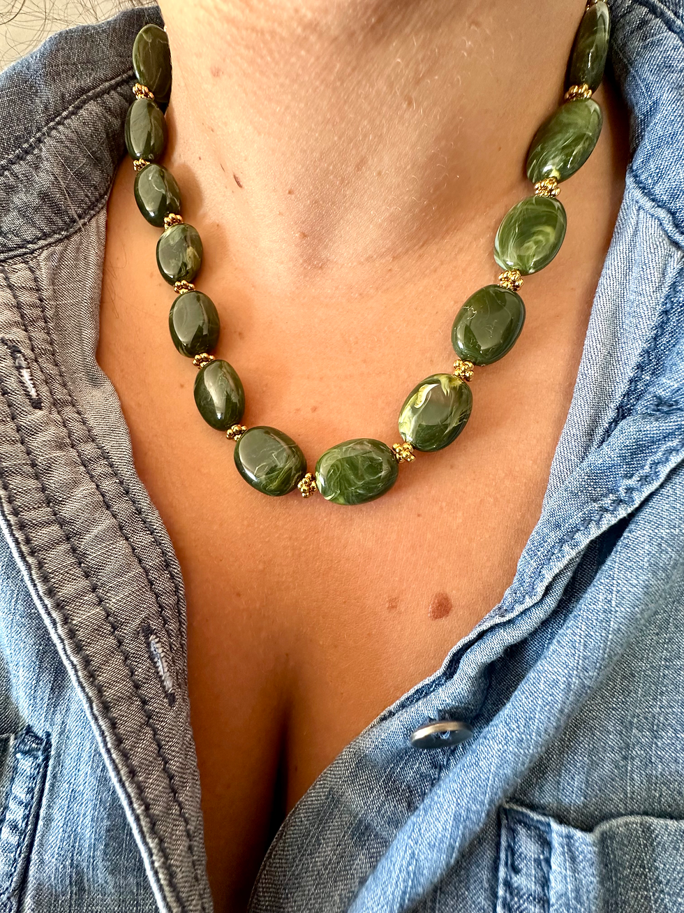 Collier fin entièrement en acier inoxydable doré (plaqué or 18k) et pendentif muni d’une pierre naturelle jaspe dalmatien.